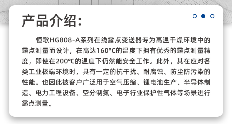 恒歌HG808-A系列在線露點(diǎn)變送器專為高溫干燥環(huán)境中的露點(diǎn)測(cè)量而設(shè)計(jì),在高達(dá)160°C的溫度下?lián)碛袃?yōu)秀的露點(diǎn)測(cè)量精度,即使在190°℃的溫度下仍然能安全工作。此外,其在應(yīng)對(duì)各類工業(yè)極端環(huán)境時(shí),具有一定的抗干擾、耐腐蝕、防塵防污染的性能。也因此被客戶廣泛用于空氣壓縮、鋰電池生產(chǎn)、半導(dǎo)體制造、電力工程設(shè)備、空分制氮、電子行業(yè)保護(hù)性氣體等場(chǎng)景進(jìn)行露點(diǎn)測(cè)量。