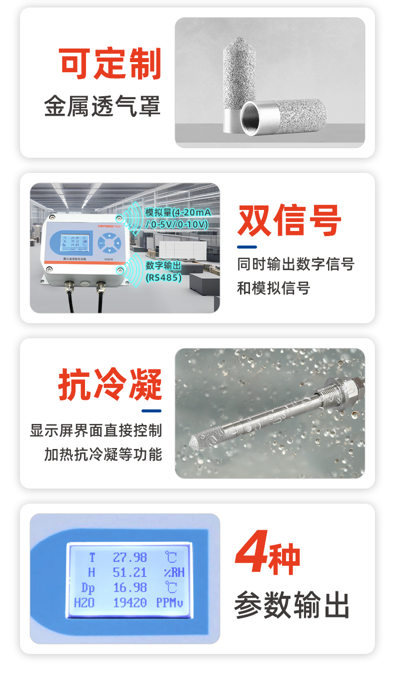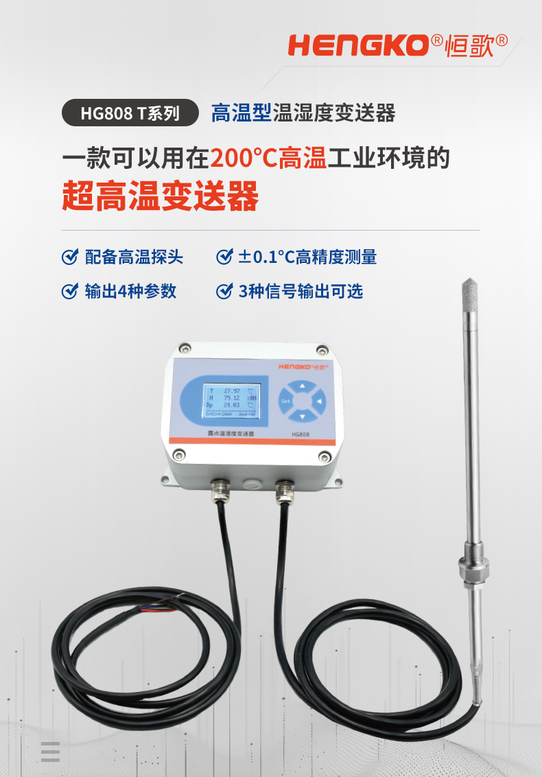 HG808-T是一款專為200°C高溫惡劣環(huán)境設(shè)計(jì)的工業(yè)級(jí)超高溫變送器,同時(shí)測(cè)量和傳輸濕度參數(shù)。采用耐超高溫的傳感元件,具有測(cè)量準(zhǔn)確、適應(yīng)溫度范圍廣、長(zhǎng)期穩(wěn)定等特點(diǎn),此外,耐高溫設(shè)計(jì)使得變送器在85~180°C高溫環(huán)境下仍然具有良好的溫濕度采集性能,廣泛被客戶認(rèn)可并成熟應(yīng)用到爐窯、高溫烤箱、焦煤氣管道等各種高溫氣體采集工況。